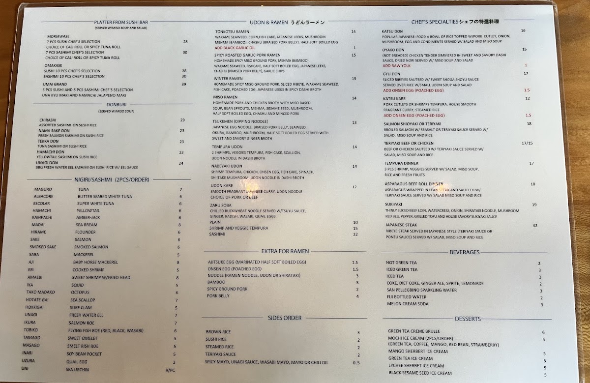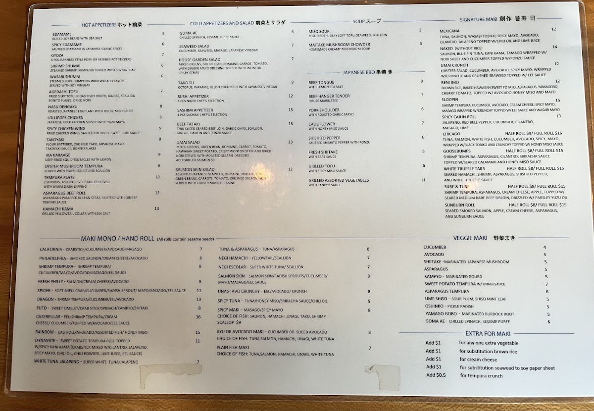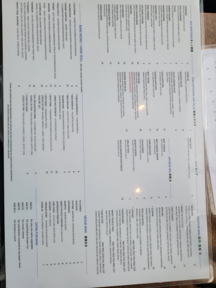 Thin sliced seared beef loin, garlic chips, scallion, ginger, daikon and ponzu sauce.